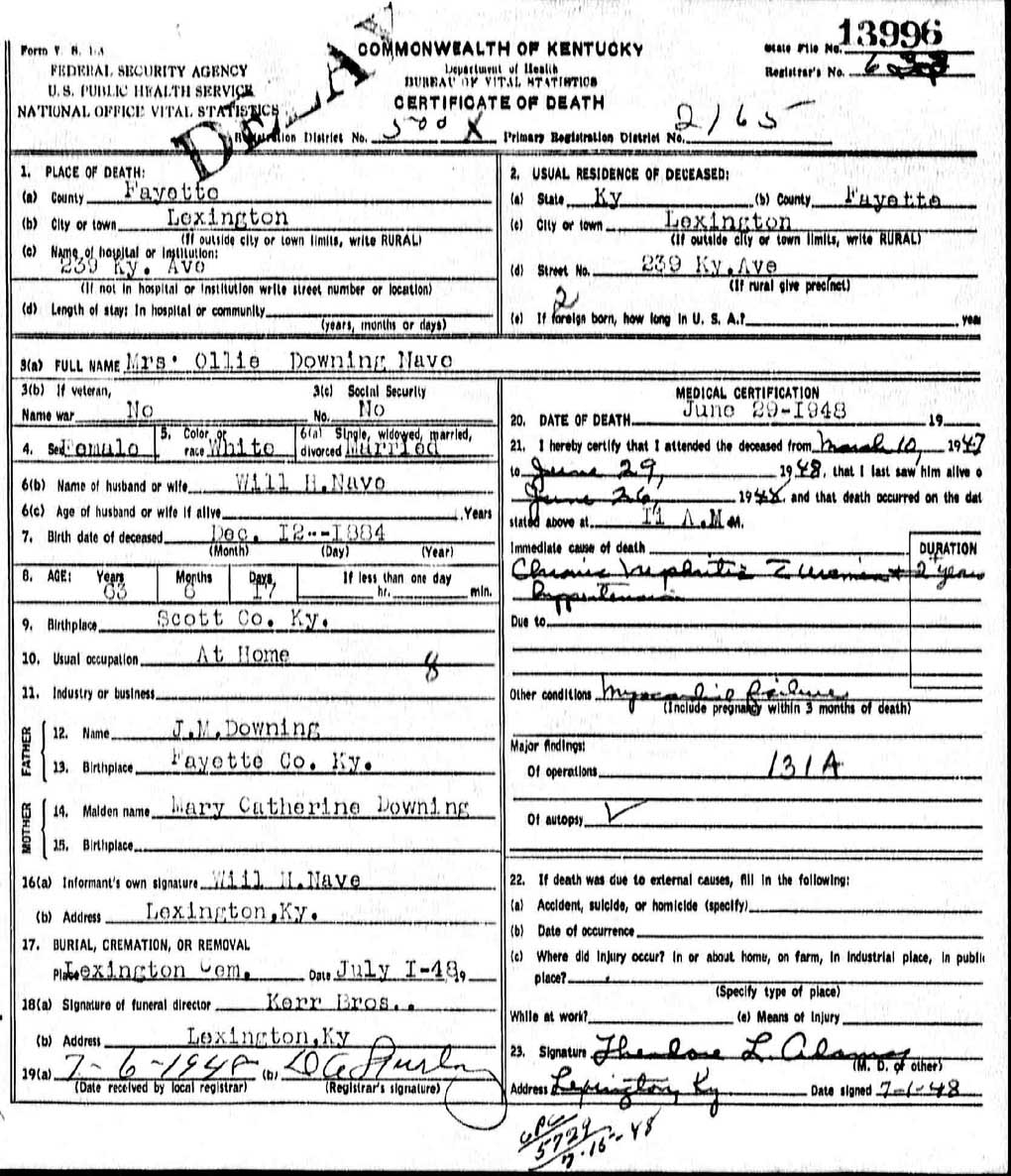 Ollie Downing [Parents] [scrapbook] was born on 12 Dec 1884 in , Fayette, Kentucky. She died 1 on 29 Jun 1948 in , Fayette, Kentucky. She was buried in Lexington Cemetery, Lexington, Fayette, Kentucky. Ollie married William H. Nave on 24 Oct 1906. |