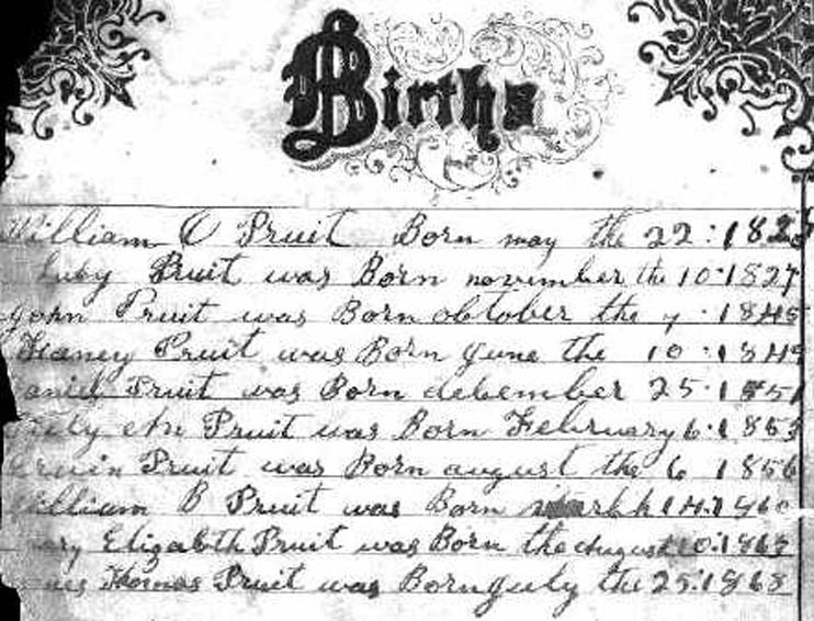 M i John Henry Pruitt was born on 7 Oct 1845. He died on 3 Mar 1916. F ii Frances (Fanney) Pruitt was born on 10 Jun 1849. She died on 16 Apr 1900. M iii Daniel Pruitt was born on 25 Dec 1851. He died. F iv Julia or July Ann Pruitt was born on 6 Feb 1853. She died in Bef 4 May 1898. F v