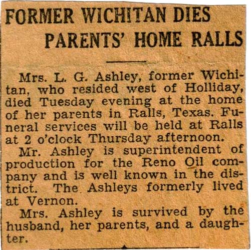 Mary Chloe Page [Parents] [scrapbook] was born in 1895 in , , Oklahoma. She died in 1931 in Ralls, Crosby, Texas. She was buried in Ralls Cemetery, Ralls, Crosby, Texas. Mary married Larry Garnett Ashley. [Notes] |