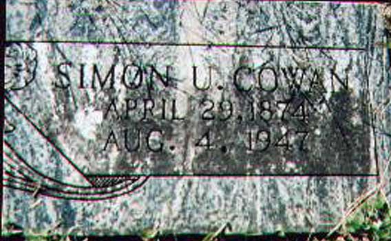 Simon Uriah Cowan [Parents] [scrapbook] was born on 29 Apr 1874 in Pettigrew, Madison, Arkansas. He died on 4 Aug 1947 in Jay, , Oklahoma. He was buried in Boston Cemetery, Madison, Arkansas. Simon married Sarah Elizabeth Hamilton. [Notes] |