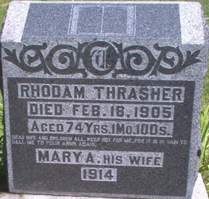 Thomas Rhodem Thrasher [scrapbook] was born on 8 Jan 1831 in , , Virginia. He died on 18 Feb 1905 in Clinton, De Witt, Illinois. He was buried on 20 Feb 1905 in Rose Cemetery, Lane, De Witt, Illinois. Thomas married Mary Ann Reckner in Jan 1850 in , , Maryland. |