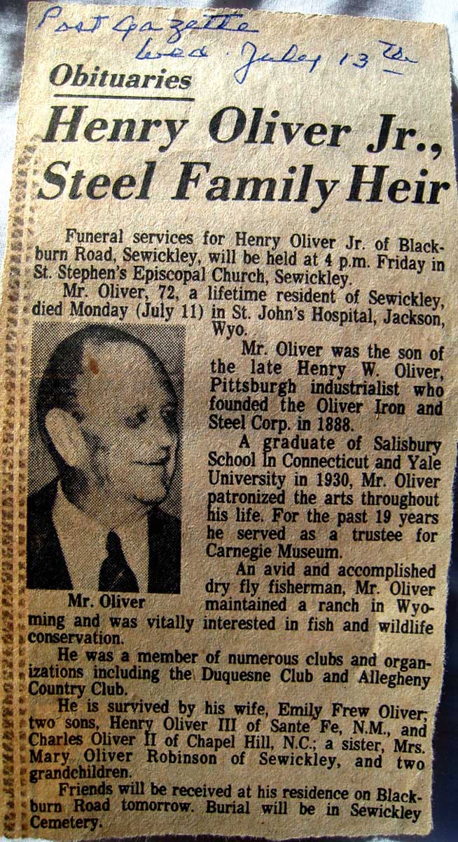 Henry Oliver Jr. [Parents] [scrapbook] was born 1 on 30 Aug 1905 in Leetsdale, Allegheny, Pennsylvania. He died 2 on 11 Jul 1977 in Sewickley, Allegheny, Pennsylvania. He was buried 3 in Sewickley Cemetery, Sewickley, Allegheny, Pennsylvania. Henry married 4 Emily Berry Frew on 1 May 1933 in Pittsburgh, Allegheny, Pennsylvania. [Notes] |