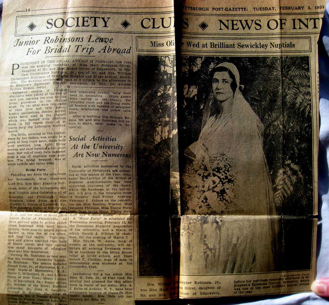 Mary Robinson Oliver [Parents] [scrapbook] was born 1 on 12 Aug 1906 in Leetsdale, Allegheny, Pennsylvania. She died 2, 3 on 14 Oct 1980 in Sewickley, Allegheny, Pennsylvania. Mary married 4 William Christopher Robinson Jr on 2 Feb 1931 in Sewickley, Allegheny, Pennsylvania. [Notes] |