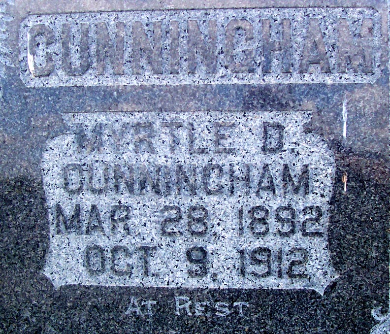 Myrtle Drusilla Cunningham [scrapbook] was born on 28 Mar 1892 in , , Missouri. She died on 9 Oct 1912 in Maysville, DeKalb, Missouri. She was buried in Oak Lawn Cemetery, Maysville, DeKalb, Missouri.