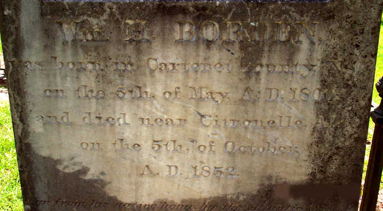 William Hull Borden [Parents] [scrapbook] was born on 5 Aug 1800 in Beaufort, Carteret, North Carolina. He died on 5 Oct 1852 in Citronelle, Mobile, Alabama. He was buried in Newbern Presbyterian Cemetery, Newbern, Hale, Alabama. William married Elizabeth Dickson in 1828 in Newbern, Hale, Alabama. |