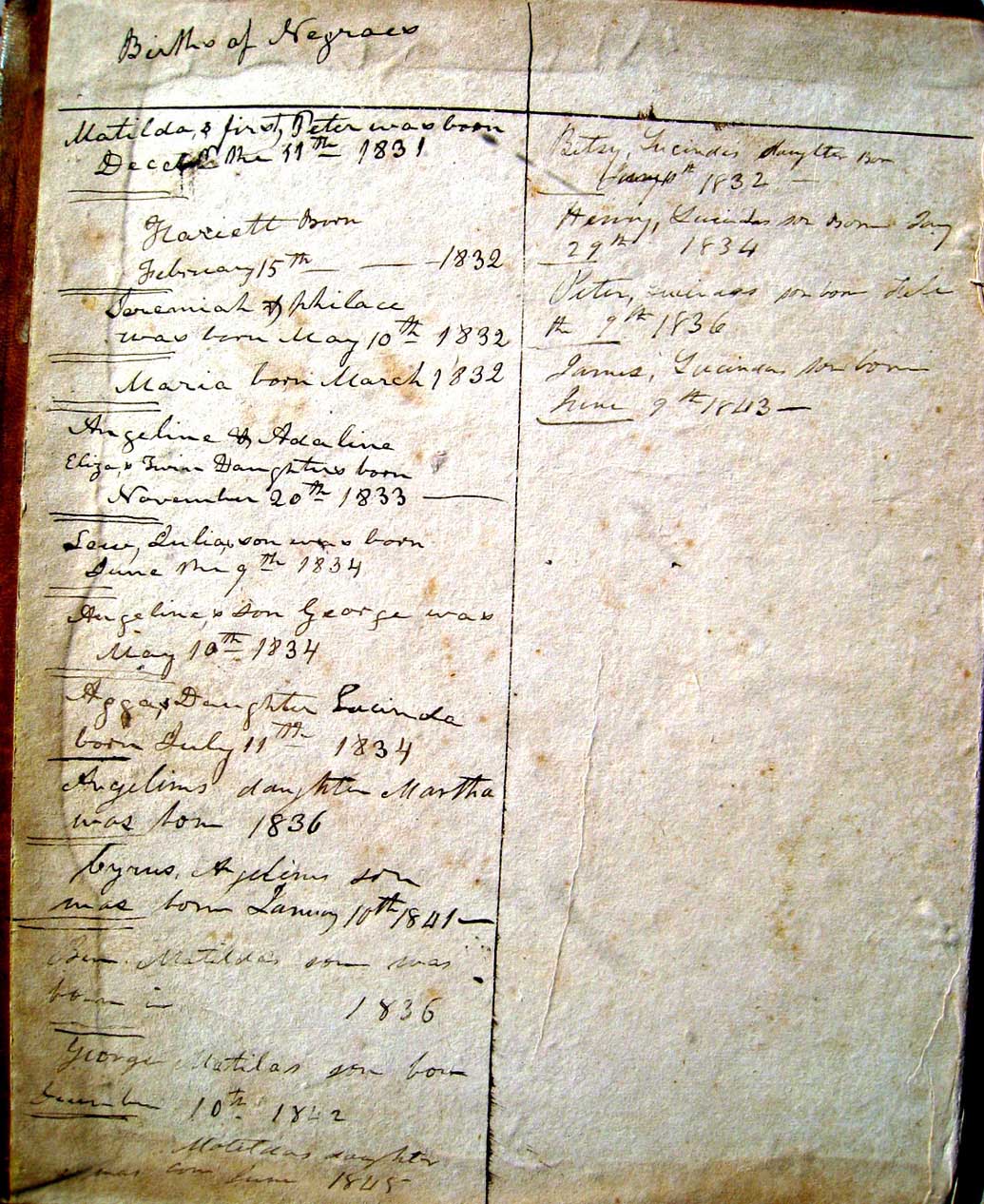 | Family Bible - Births NegroesFamily Bible - Names & dates of Negro slaves |