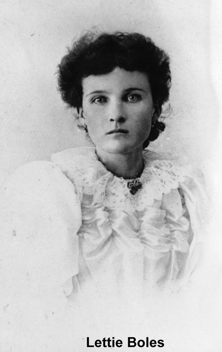 Lettie Mae McDermott [scrapbook] was born on 12 Jan 1877 in , , Kansas. She died on 29 Mar 1934 in Kansas City, Jackson, Missouri. She was buried in Howell Cemetery, Barton, Missouri. Lettie married Robert Lee Boles in Bef 1898 in , Barton, Missouri. |