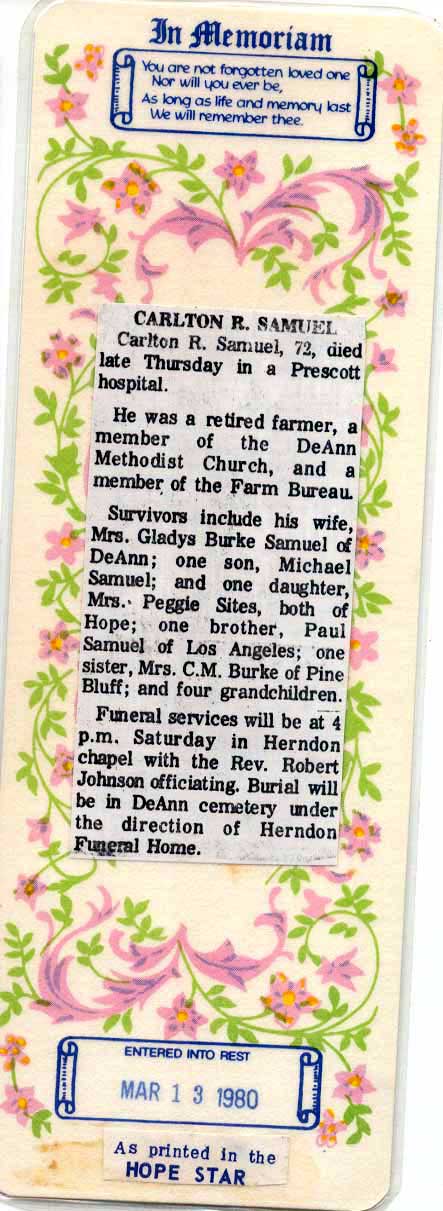 Carlton Richard Samuel [Parents] [scrapbook] was born on 16 Sep 1907 in De Ann, Hampstead, Arkansas. He died on 13 Mar 1980 in Prescott, Nevada, Arkansas. He was buried in White Oak Cemetery, De Ann, Hampstead, Arkansas. Carlton married Gladys Burke on 5 Dec 1931 in De Anne, Hampstead, Arkansas. [Notes] |