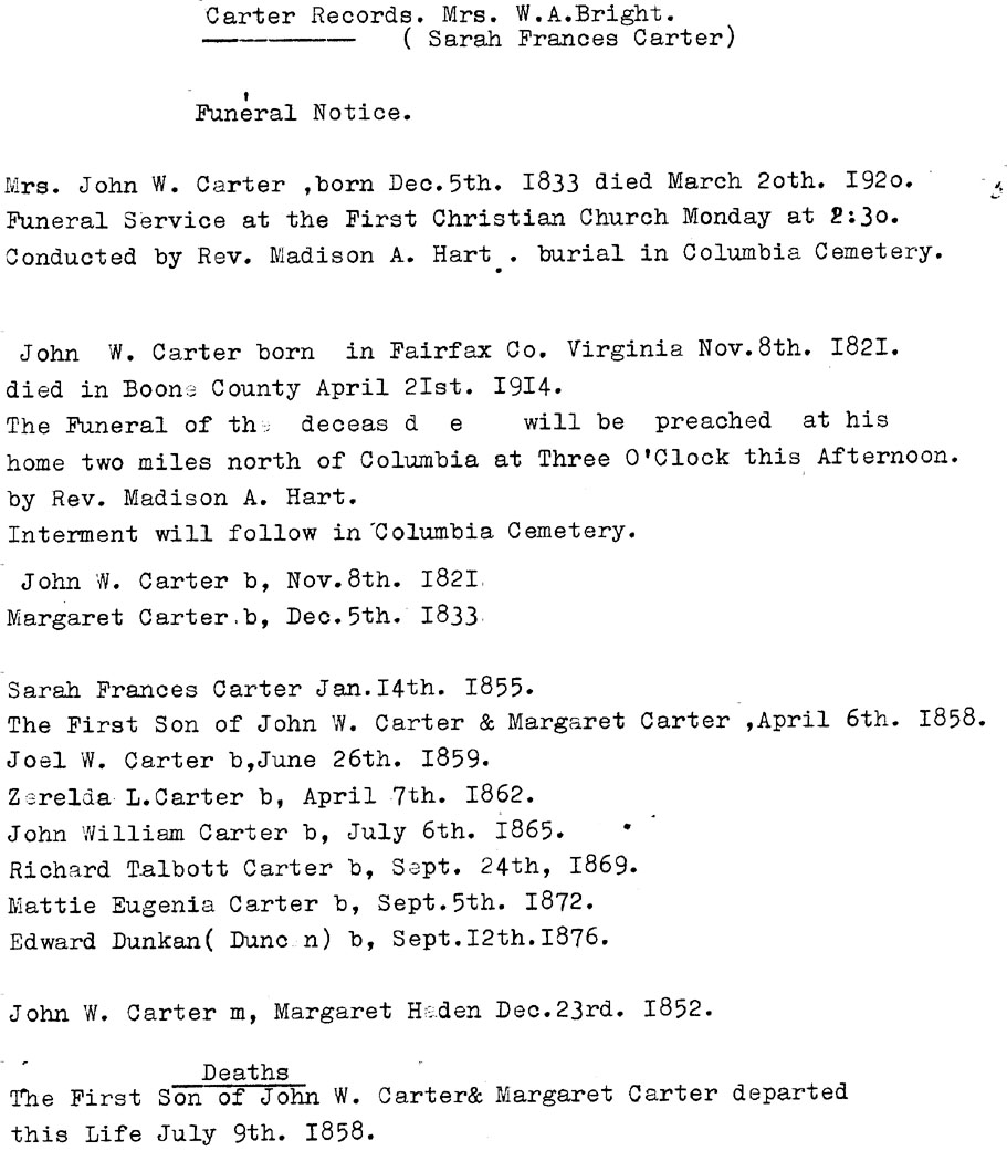 W. A. Bright died. W. A. Bright married Sarah Frances Carter.
