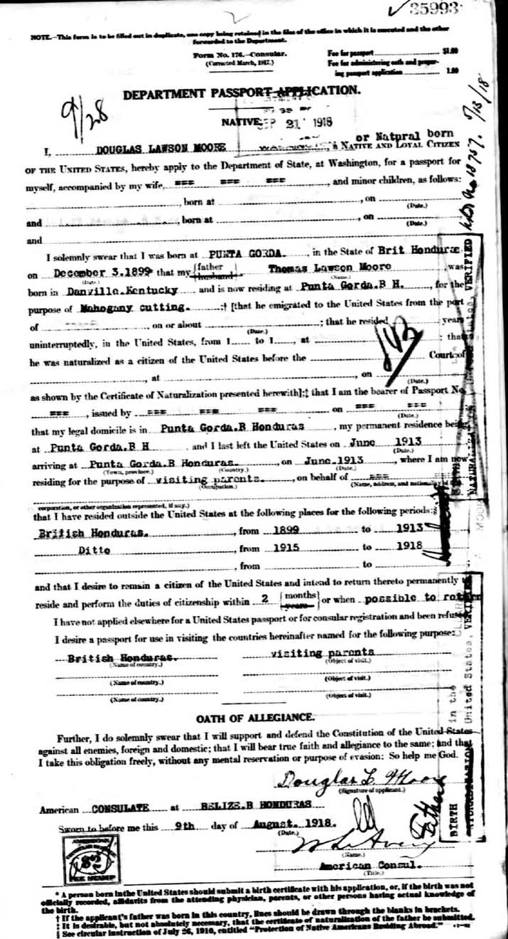 Douglas Lawson Moore [Parents] [scrapbook] was born on 3 Dec 1899 in Punta Gorda, British Honduras, Caribbean. He died on 24 Jan 1975 in Birmingham, Jackson, Alabama. He was buried in Elmwood Cemetery, Birmingham, Jefferson, Alabama. Douglas married Frances Milton Birdsong on 2 Jan 1923 in , Giles, Tennessee. [Notes] |