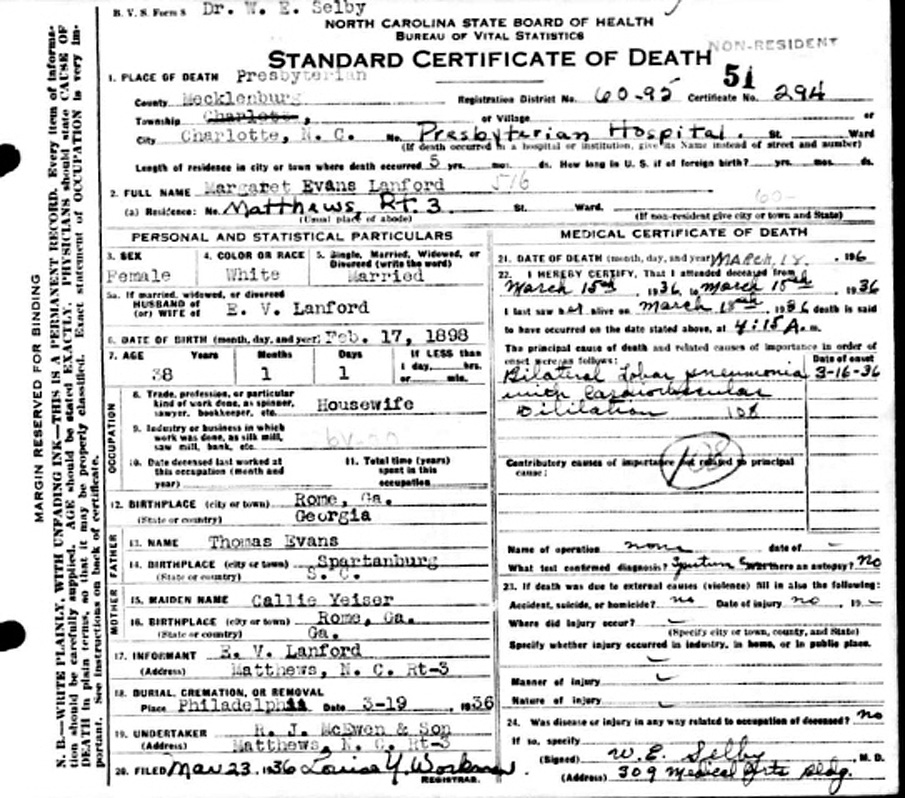 Margurite Eleanor Evins [Parents] [scrapbook] was born on 17 Feb 1898 in Rome, Floyd, Georgia. She died on 15 Mar 1936 in Charlotte, Mecklenburg, North Carolina. Margurite married Evins Van diver Lanford. |