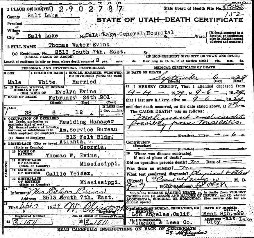 Thomas (Tom) Waters Evins II [Parents] [scrapbook] was born on 24 Mar 1901 in Atlanta, Fulton, Georgia. He died on 6 Sep 1929 in Salt Lake City, Salt Lake, Utah. Thomas married Evelyn May Fairbairn. [Notes] |