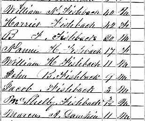 Harriet Newell Fishback was born on 24 Feb 1844 in , , Kentucky. She died on 14 Sep 1845 in , , Kentucky. M vii Jacob Fishback was born on 25 Jun 1847. M viii McShelby Fishback was born on 10 Jun 1850. He died after 1909.