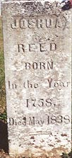 Joshua Reed [scrapbook] was born on 29 Oct 1757 in Morris Township, Morris, New Jersey, United States. He died on 16 May 1838 in Paoli Twp, Orange, Indiana. He was buried 1 in Stampers Creek Cemetery, Paoli, Orange, Indiana. Joshua married Hannah Peck 2 on 6 Apr 1826 in , Orange, Indiana. Other marriages:McClelland, Johanna [Notes] |