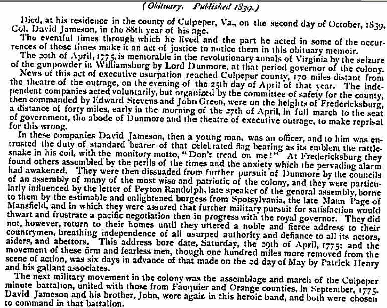 Lieutenant David Jameson [Parents] [scrapbook] 1, 2, 3, 4 was born on 19 Aug 1752 in Orange (now Culpeper) County, Colony of Virginia, British Colonial America. He died on 2 Oct 1839 in Redwood, Culpeper, Virginia. He was buried 5 in Masonic Cemetery, Culpeper, Culpeper, Virginia. David married Mary Mennis on 25 Aug 1792 in York, Virginia. |