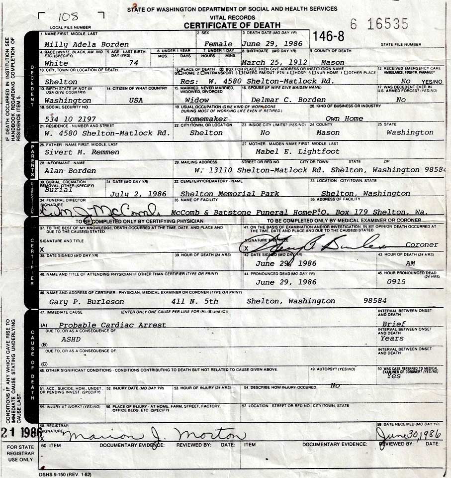 1986 in Shelton, Mason, Washington. Mildren married Delmar Caley Borden on 21 Jul 1934.
