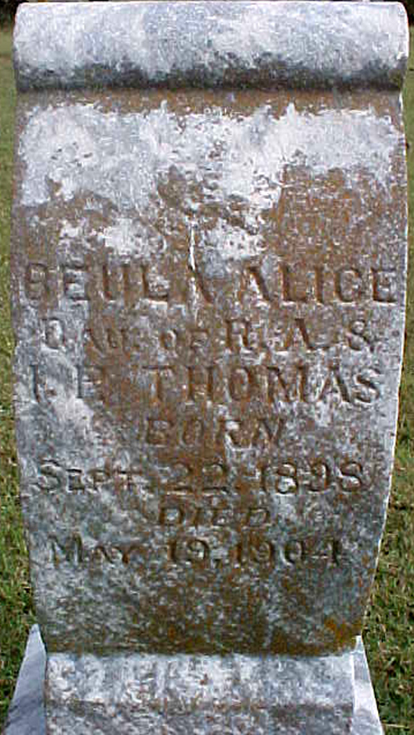 | Tombstone BEULA ALICE - DAU. OF R.A. & I.P. THOMAS - BORN SEPT. 22, 1898 - DIED MAY 19, 1904 |